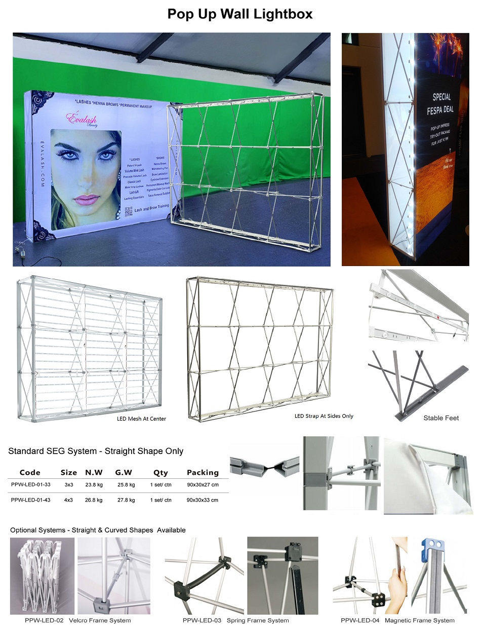 | SKU: PPW-LED-01 Material: Alu. tubes+Plastic Conectors+SEG Groove+LED Size: 1x3/2x3/3x3/4x3/5x3 Color: Silver/Black Carrybag: Hand Carrybag or Optional Wheeled Trumk MOQ: 10PCS Packing: 1PC/CTN Life Time: 1 Year+ | |||||||||
