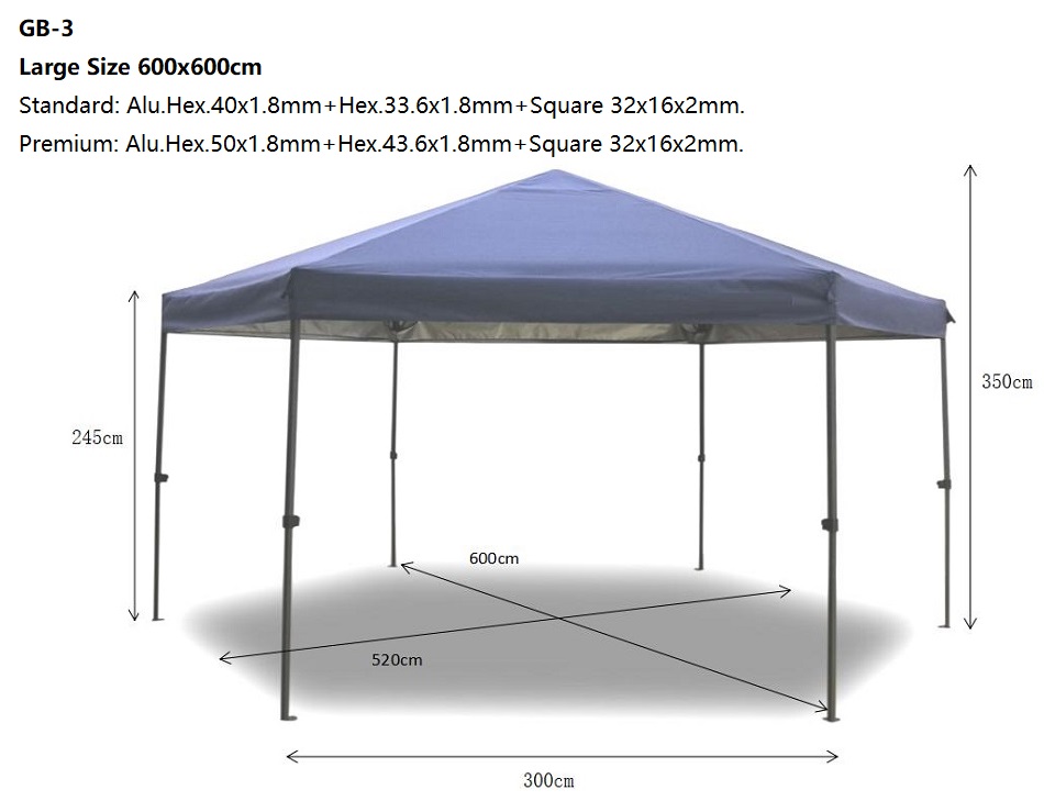| SKU: GB-3 Size: 3.6x3.6x2.4M / 6x6x3.5M Material: Steel pipes square 25x0.5mm, Alu.pipes Hex 40x1.8mm, Hex.50x1.8mm 210D/300D/600D Oxford fabric Colours: Any MOQ: 100pcs for steel frame; 10pcs for alu.frames Packing: 1pc/carton Life Time: 2Year + | |||||||||