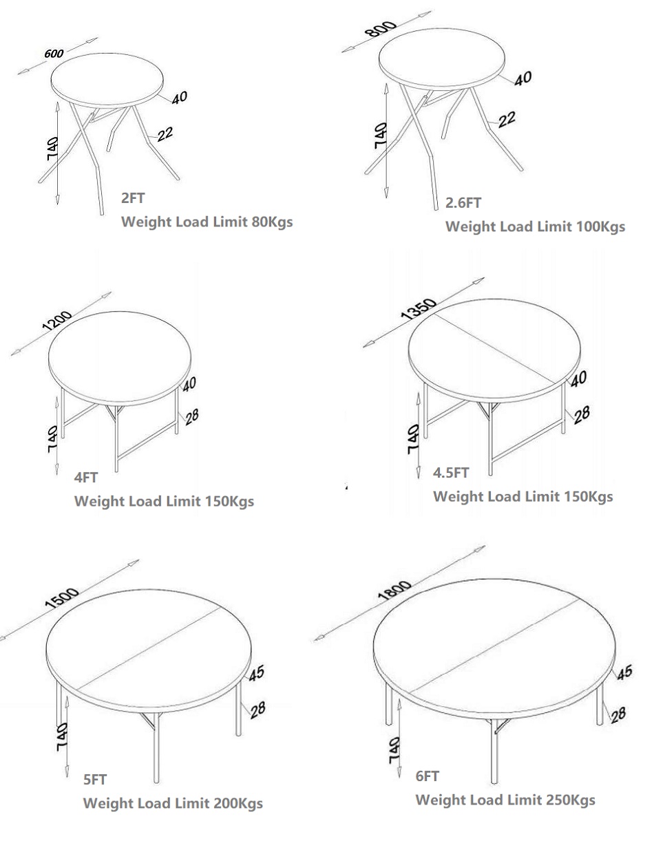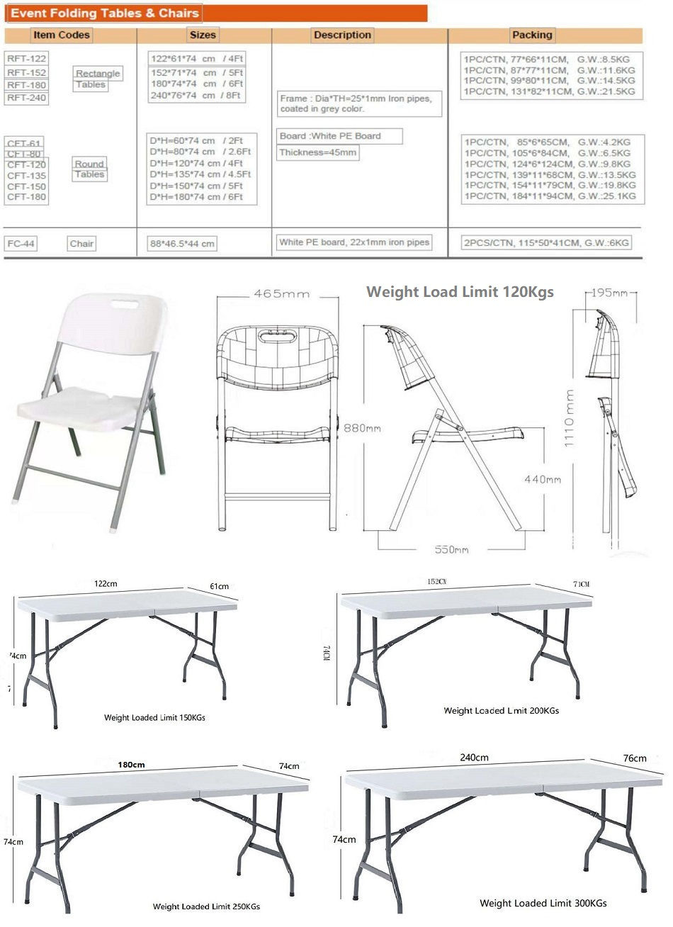 | SKU: RFT-122/152/180/240 Size: 4/5/6/8FT or Other Sizes Material: Legs: 25x1mm Iron Pipes in Grey Color Board: PE in White Color MOQ: 10pcs Packing: 1pc/carton Shipping: By Express/By air/By sea Life Time: 3Year + | |||||||||